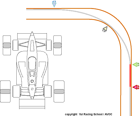 さぁペースを上げてから最初のコーナーだ。トランジッションに気をつけてスロットルペダルから右足をブレーキペダルに移す。直進状態ではグリップの全部を減速に使える。踏みすぎてクルマのバランスを崩すな!